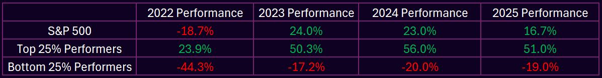 Performance Dispersion facts – This was the dispersion in the S&P 500 universe between 2022 and 2025.